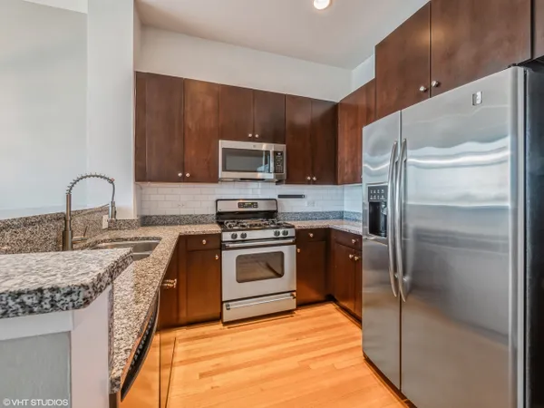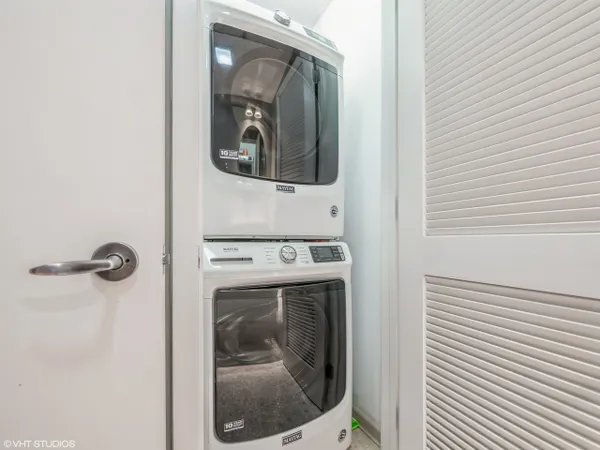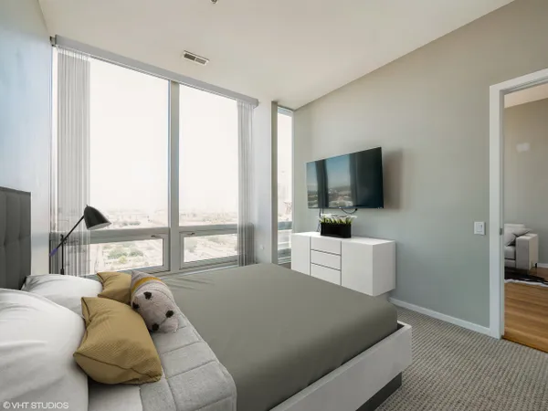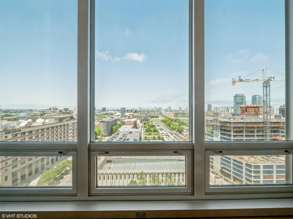 Beautiful 2 bed/1.5 bath apartment in the Montgomery of River North! This home features floor to ceiling windows with 10 foot ceilings and hardwood floors in the main living area. The kitchen contains custom cabinetry, granite countertops, stainless steel appliances & a large breakfast bar with room for bar stools. The open concept floor plan is perfect for entertaining! The primary suite is spacious with two organized closets, remote controlled black out blinds, and a large marble bathroom with a dual vanity and deep soaking tub. The second bedroom is ideal for an office, nursery, or single bed (8x8 size room). Two smart wall mounted TVs and router included. The powder room was renovated and contains a laundry closet with full-size in-unit washer dryer! Assessments include A/C, high-speed internet, gas and Direct-TV cable. The Montgomery is a fully amenity building with 24-hour door staff, on-site management, in-house engineer, fully equipped gym, roof deck with panoramic city views, professionally landscaped grounds with fire pits and grills stations, private dog run, in-unit package delivery service, and dry cleaners. This building is located on one of River North's most beautiful tree-lined streets, steps to the Chicago River, Montgomery Ward Park, Bian, East Bank, and all of the neighborhood's shopping and night life. Storage cage included. Deeded heated indoor garage parking available for 25K.