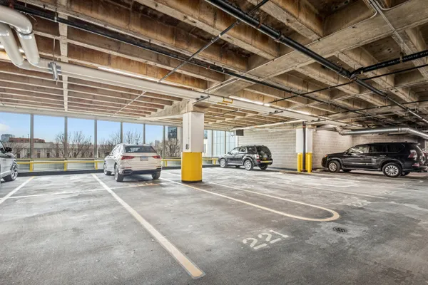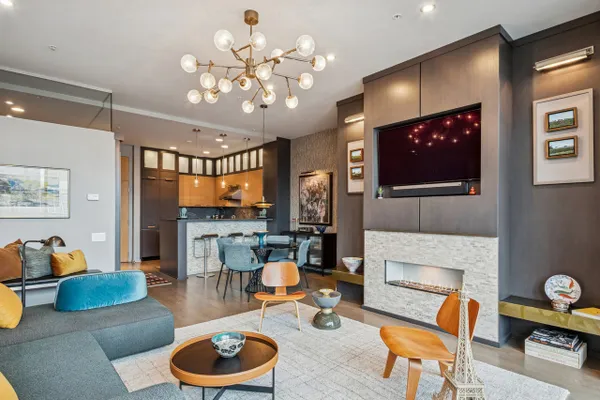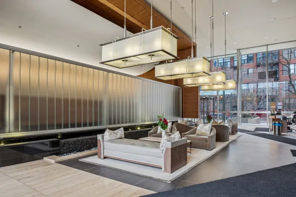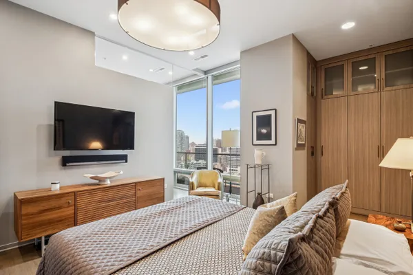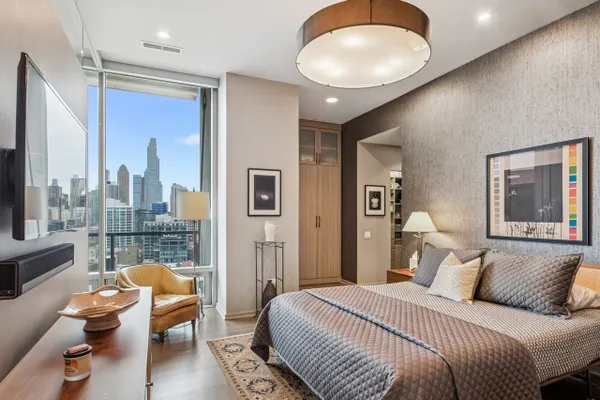 This stunning home at the iconic Minoru Yamasaki-designed "Montgomery" is a 2BR 2BA condominium in the quieter section of River North. The Unit boasts a rare and exclusive East-facing balcony with breathtaking skyline views at sunrise and sunset, visible through floor-to-ceiling windows. This unit has been extensively renovated and professionally designed. White oak floors grace the beautiful space and lead to a custom-designed media wall, gas fireplace, and TV niche with Sonos speakers. Warm, custom lighting illuminates the home, welcoming you after a long day of enjoying the heart of River North. The exquisitely renovated kitchen charms with sleek soapstone countertops and backsplash, custom cabinets, stainless steel Thermador appliances and hood, and a wood-paneled fridge. A custom bar and wine fridge, tastefully hidden in a stylish cabinet, punctuates this chef's kitchen. The spacious primary suite features two walk-in closets and a stunning floor to ceiling built-in wardrobe, along with a luxurious spa-like bath with a six foot soaking tub, separate shower, double vanity and large linen closet. A guest bedroom and bath complete this elegant Unit, along with more than ample custom closets and storage. There are absolutely NO common shared walls, creating a quiet and private living space. The Unit includes TWO parking spaces on the most desirable Level 2 of the heated garage! The "Montgomery" is an extremely well managed building with substantial reserves. In addition to the roof-top space, spectacular for viewing July 4 fireworks and the Air and Water Show, owners can enjoy the "North Lawn" outfitted with lounge areas, table seating, fire pits, and BBQ grills. Assessments include owner-controlled heat and air conditioning, cable TV and all but a small monthly electric bill. Visit this warm and inviting home in close proximity and with easy access to everything the City has to offer!