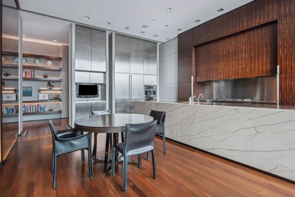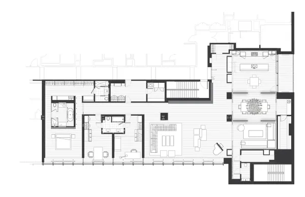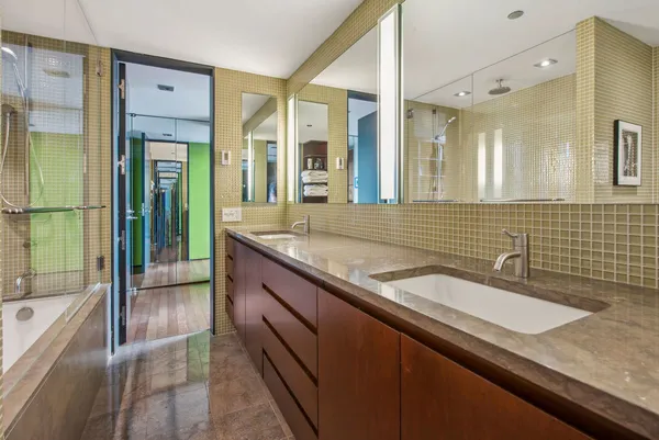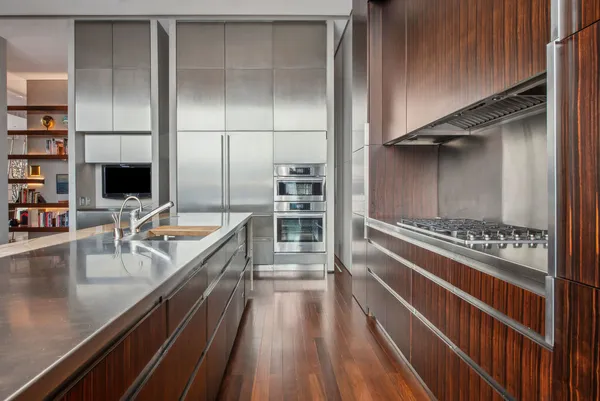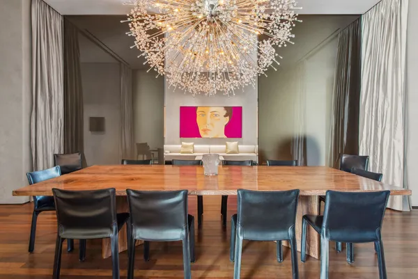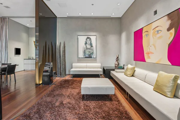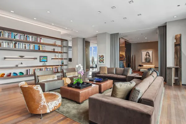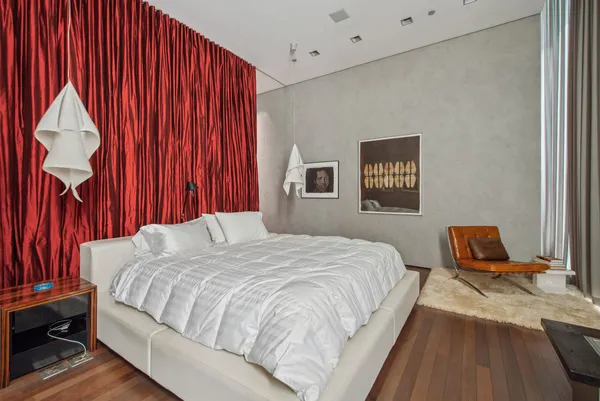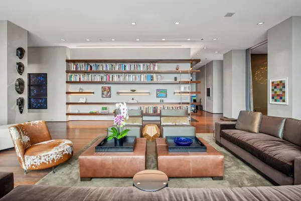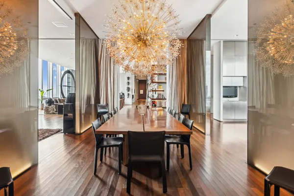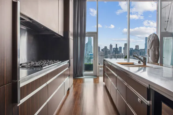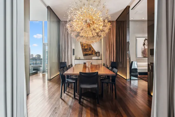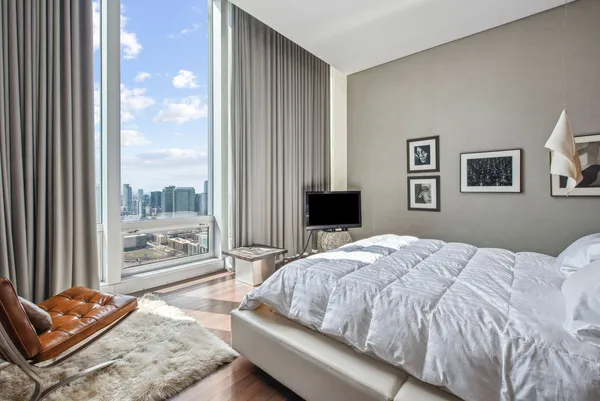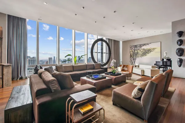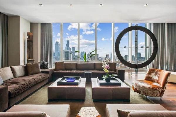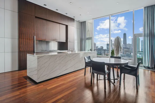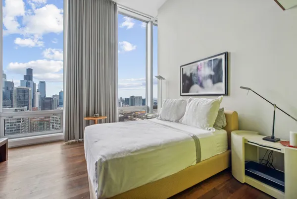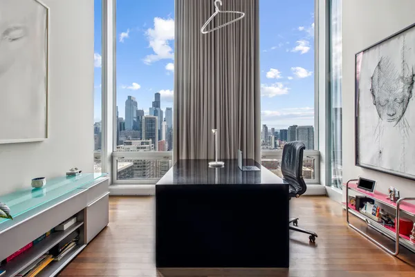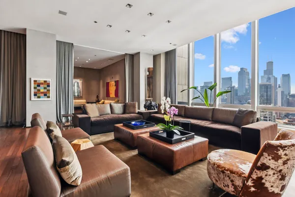 This unique residence is situated on the 26th floor of The Montgomery, which was originally the building's top level. Designed in collaboration with the acclaimed architect Wheeler Kearns, the current owners have created a space that functions as both a home and a gallery. The residence was intentionally crafted to showcase art and host large gatherings. With 13.5-foot soaring ceilings and floor-to-ceiling windows facing east and south, the home is flooded with natural light and offers sweeping views of the city skyline. A wall of custom mahogany shelves wraps around a corner of the living space, providing display nooks for art, sculptures, or books. The rich ipe hardwood floors create a striking contrast against the light gray walls, which were chosen for their neutrality and ability to enhance both the artwork and the natural light. The residence boasts ample living space, with both the living and dining areas designed for entertaining. Adjacent to these areas is a flexible space that can serve as a home theater, seamlessly integrated into the main living room. The kitchen features a blend of stainless steel, ebony mahogany, and veined stone in simplified flat panel designs, creating a warm yet minimalist atmosphere. The luxurious primary suite includes dual spa-caliber bathrooms and a custom walk-through closet. There are two additional bedrooms connected via a bathroom, each benefit from an enclosed lofted space, nearly doubling the size of the bedrooms. The home features a 130-square-foot east-facing balcony, perfect for enjoying morning coffee or alfresco dining. Additionally, it comes with four parking spaces and two oversized storage rooms. This residence offers a rare combination of artistic design, modern elegance, and cultural depth, all set against the iconic backdrop of Chicago's skyline. Residents of The Montgomery benefit from premier full-service amenities, including 24-hour door staff, a fitness center, a rooftop deck, and a dog-walking area. Assessment: 5193 - includes all 4 parking spaces + electric charger fee. 2023 Taxes: with senior + HO exemption - 41,887.40 - Building Reserves 4.282M, no upcoming specials, HOA includes ALL utilities (except electric), 2 dogs allowed per unit with no weight restrictions.